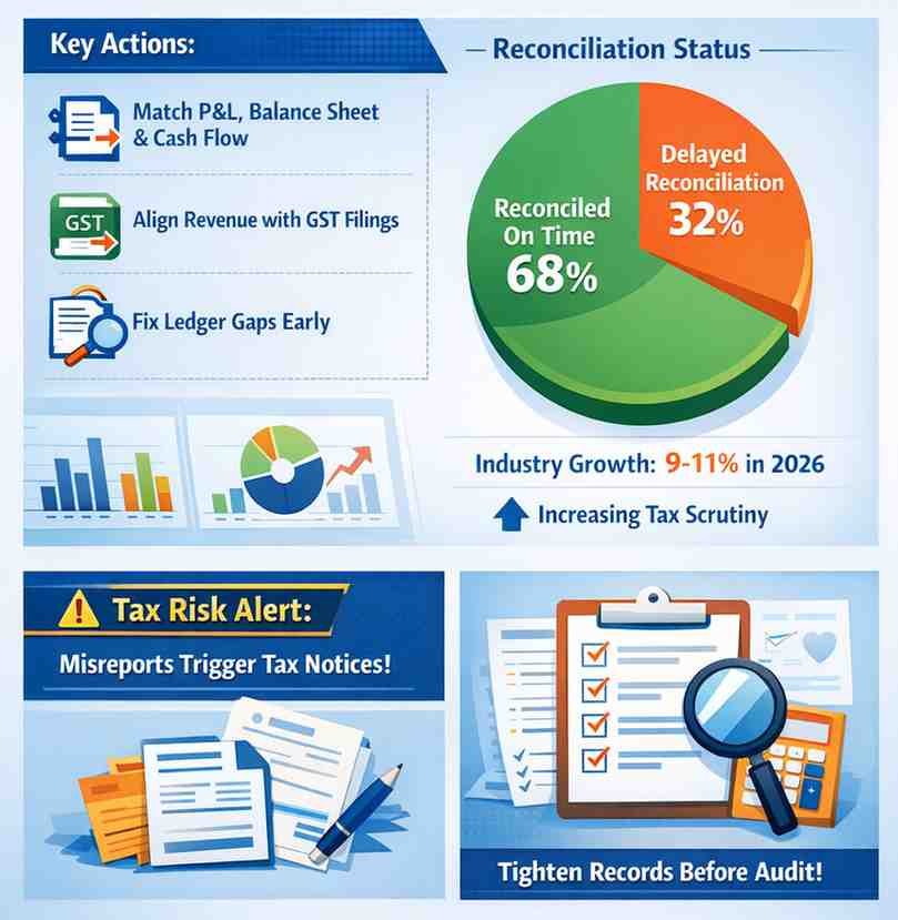 Start by tightening your financial reconciliation. Match your P&L, balance sheet, and cash flow so every number tells the same story. Make sure your revenue aligns with GST filings—this is where most mismatches show up. Fix ledger gaps early, not during the audit. Even small errors can trigger tax notices. And with pharma growth picking up in 2026, scrutiny is only getting sharper.