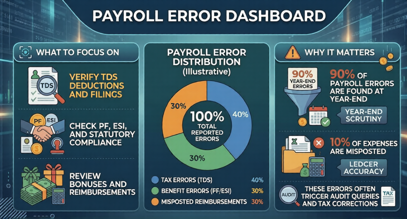 Payroll is one area where small mistakes turn into big problems at year-end. Start by verifying TDS deductions and ensuring all filings are accurate. Check compliance with PF, ESI, and other statutory requirements, and review how bonuses and reimbursements have been recorded. These details matter because nearly 90 percent of payroll errors are only caught during year-end audits, and about 10 percent of expense claims are misposted. If not corrected in time, these issues can lead to audit questions, tax adjustments, and unnecessary compliance pressure.
