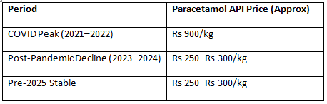 A previous report shows that paracetamol API prices in India stood near USD 2,958 per metric ton during Q2 2025 (roughly Rs 2,350/kg at an exchange rate of ~Rs 80 per USD), underscoring how rapidly costs can move with changing supply conditions.