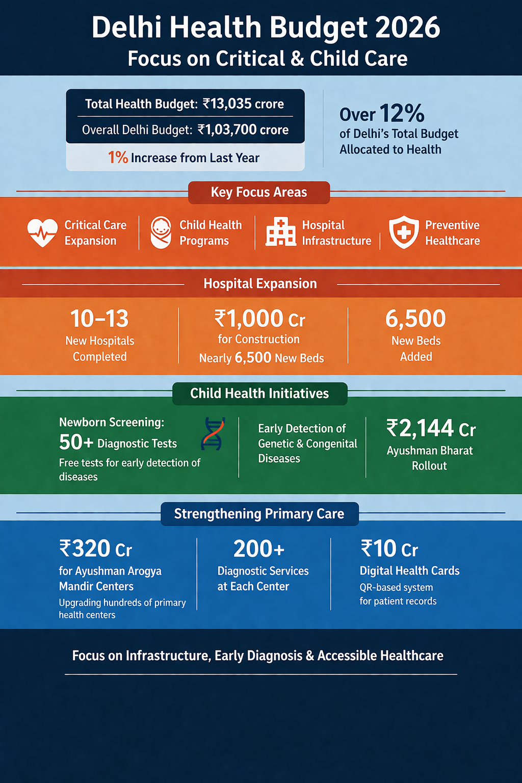 Overall, the Delhi Health Budget 2026 reflects a clear shift in strategy rather than scale. Instead of a large funding jump, the government is focusing on strengthening healthcare delivery through infrastructure, early diagnosis, and preventive care. The approach aims to reduce long-term pressure on hospitals while improving access, efficiency, and outcomes across the city’s healthcare system.